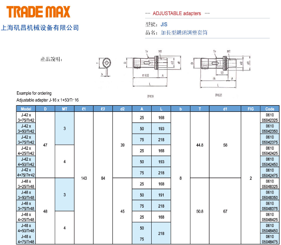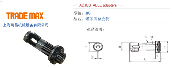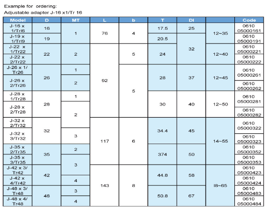 • Product description: ER bit adjusting sleeve: AJ - ER JIS bit adjusting sleeve: J - 16 * 1 / Tr16... 19... 22... 26... 28... 32... 35... 42... J - 48 * 1 / Tr48 ISO bit adjusting sleeve: 1-16 * 1 / Tr16... 20... 25... 2