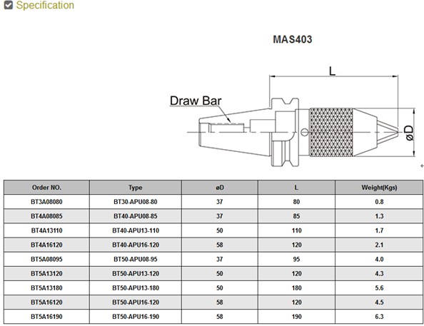 • Product description: BT/APU DRILL CHUCK ADAPTOR:BT30→M12 x 1.75P,BT40→M16 x 2.0P,BT50→M24 x 3.0P